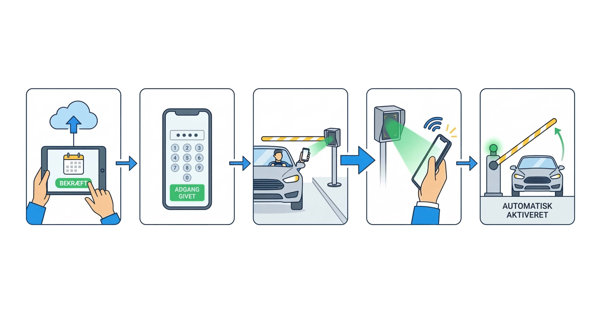 Ved ankomst – adgang via bom / chip / kode / nummerplade — alt styres digitalt.